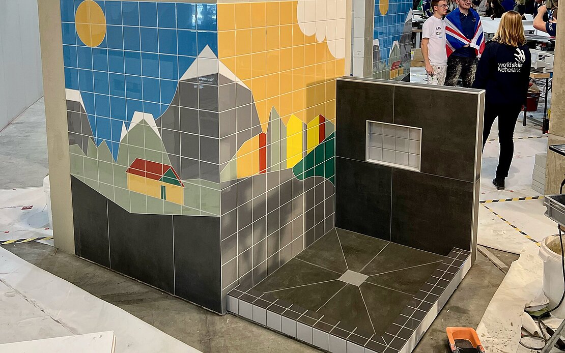 Die Teilnehmer, die aus Europa, Asien, Südamerika und Afrika kamen, mussten innerhalb von 22 Stunden zwei Wandmodule gestalten, dazu den Gefälleboden inklusive Rückwand – eine der Wände in einer Kombination von Wand- und Bodenfliesen. Das Motiv waren die Dolomiten-Silhouette und ein Chalet. „Dieses Projekt beinhaltete einige Herausforderungen und war handwerklich sehr aufwendig – nur fünf Teilnehmer gelang die komplette Umsetzung. Und die erreichten die Top fünf“, so Bundestrainer Marcel Beyer. WM-Starter Yannic Schlachter hatte beim letzten offiziellen Training eine Aufgabe gestellt bekommen, die ungefähr der in Bozen entsprach. „Die Änderungen fielen deutlich schwerer aus, genau das hatten wir erwartet und wir konnten so gut und schnell reagieren.“ Jeder Wettkampftag wurde von Trainer und Teilnehmer ausgewertet, die weiteren Arbeitsschritte intensiv besprochen. Vor allem den Boden sollte Yannic Schlachter besonders sorgfältig gestalten, „in der Bewertung nahm dieses Element einen großen Platz ein“.