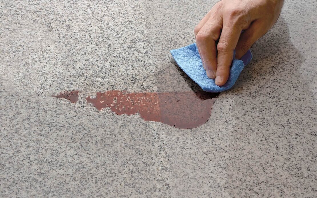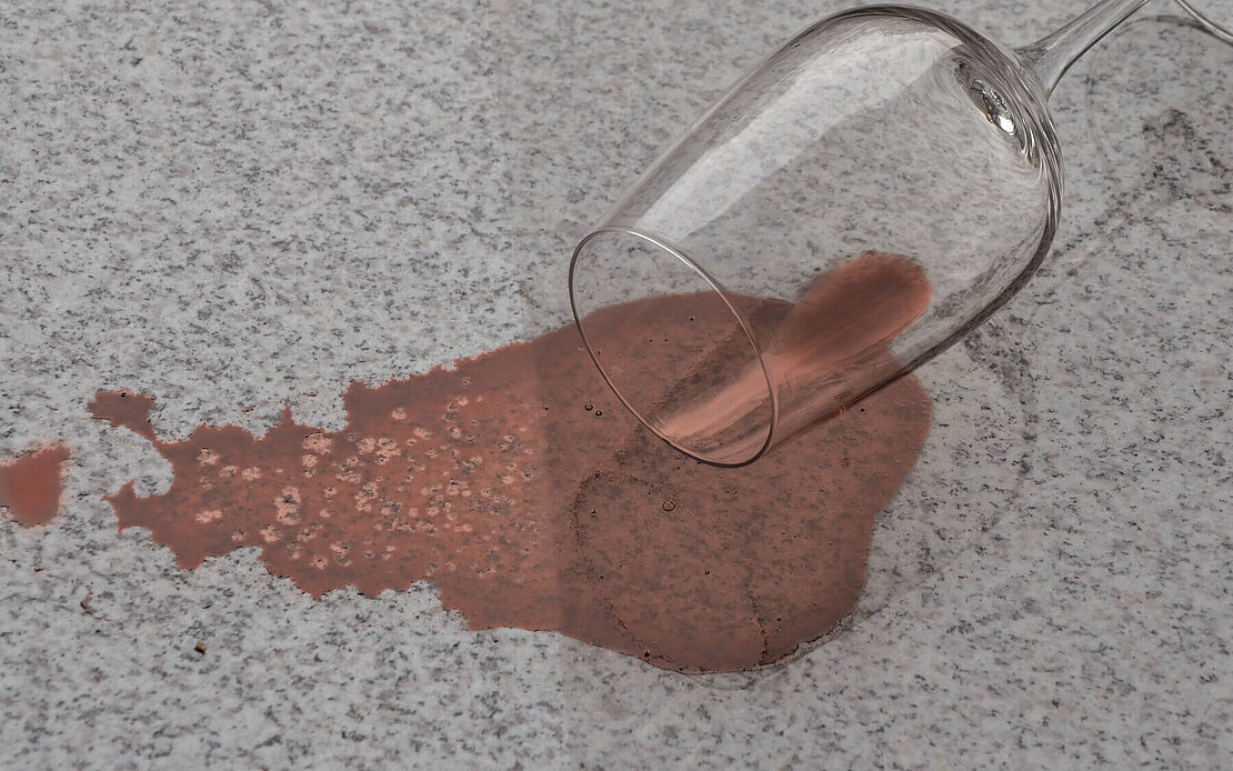 Rotwein lässt sich, wenn umgehend gehandelt wird, mit saugfähigen Papiertüchern selbst von einem unbehandelten Naturstein nahezu komplett aufnehmen. Wird jedoch das Missgeschick erst später bemerkt, ist der Rotwein in die Poren und Kapillaren eingezogen und unter Umständen bereits eingetrocknet. Die nicht flüchtigen Bestandteile des Weines, wie Gerbstoffe und Farbstoffe, haften an den Mineralien dann so stark, dass die Kraft des Wassers nicht mehr ausreichend ist. Insbesondere von ungeschützten Natursteinoberflächen lassen sich diese Flecken kaum noch mit klarem Wasser oder Spülmittelzusätzen entfernen.