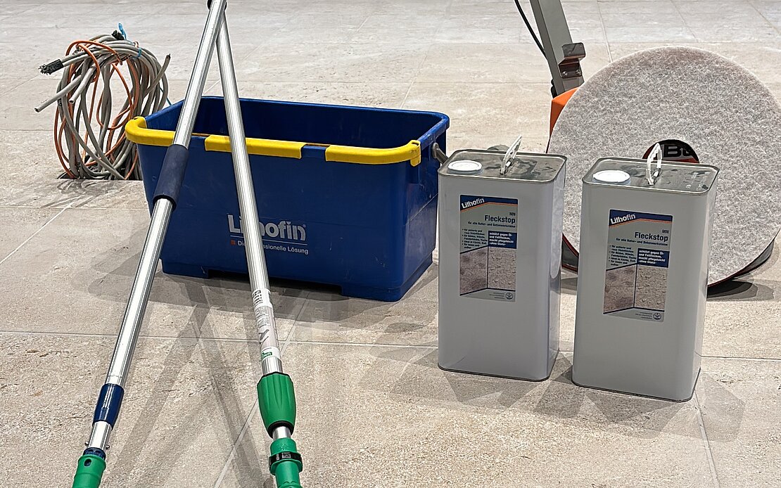 The Crailsheim shell limestone floor, finely sanded in the Pergamon Museum in the Garden Hall, was impregnated with Lithofin MN Stain-Stop.