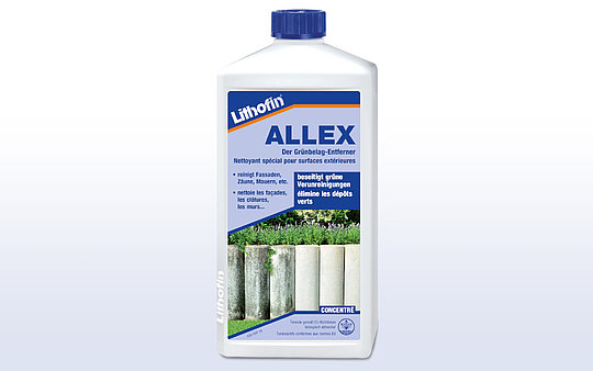 Les algues ou traces de verdissure peuvent être enlevées avec Lithofin ALLEX*. Pour avoir une surface propre, il faut une fois par an vaporiser Lithofin ALLEX*, de préférence au printemps.