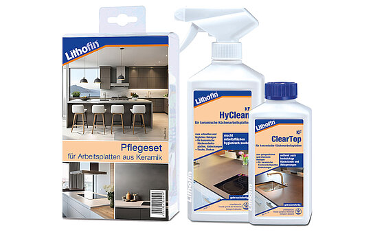 Le kit d'entretien Lithofin contient les produits nécessaires pour les surfaces céramiques.