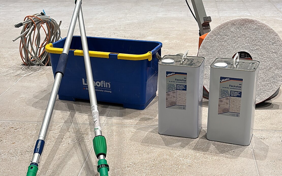 De kalkstenen vloer van Crailsheim-schelp, fijn geschuurd in het Pergamonmuseum in de Tuinzaal, werd geïmpregneerd met Lithofin MN Vlekstop.