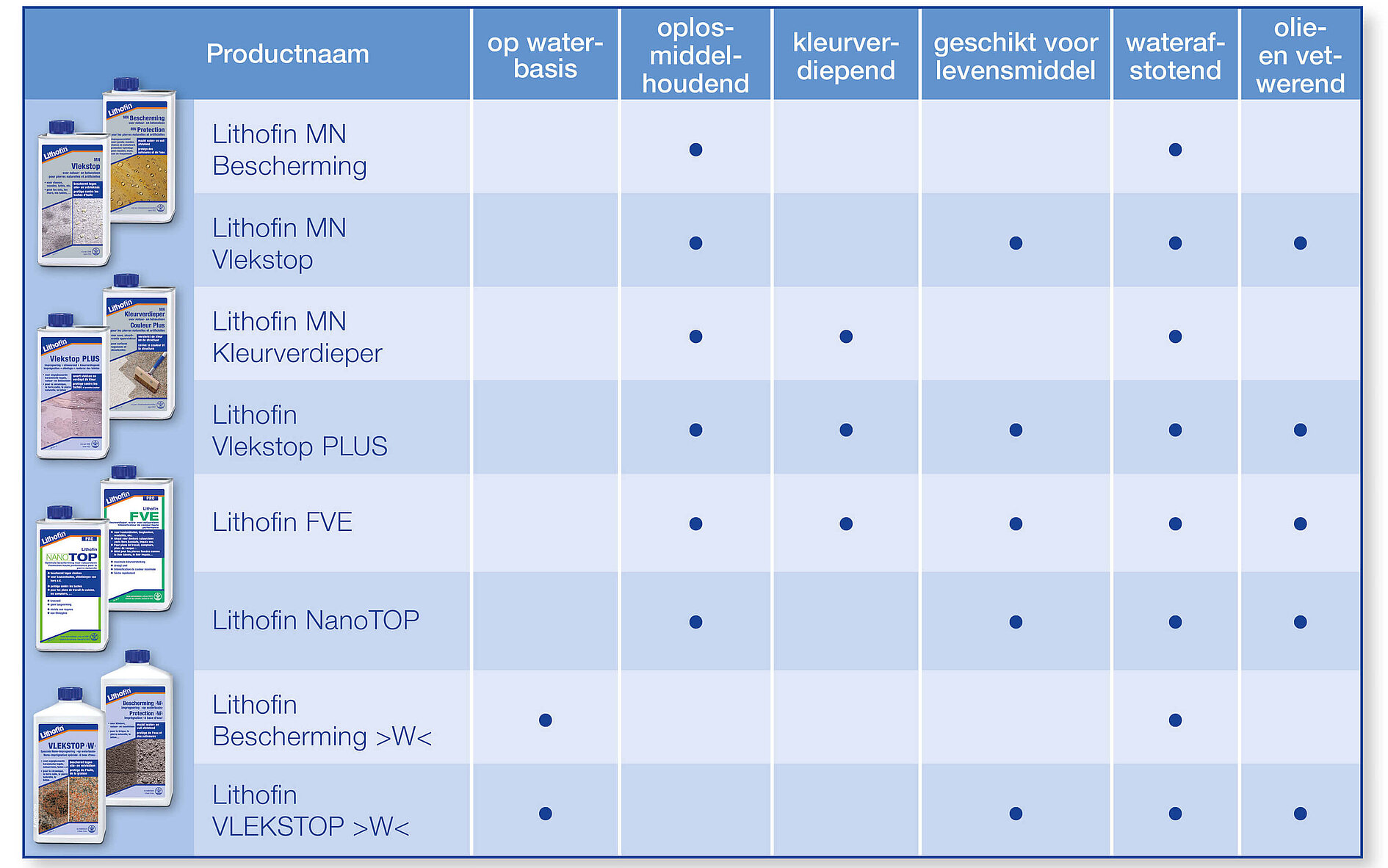 Met onze tabel krijgt u snel een overzicht van de eigenschappen van onze impregneermiddelen