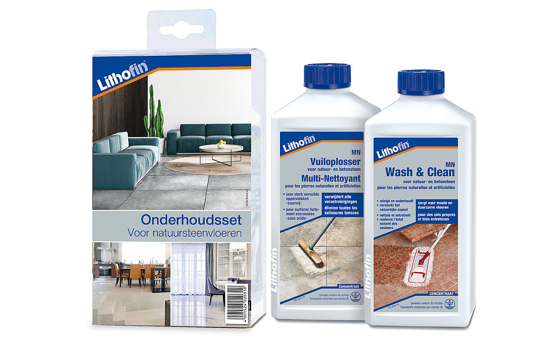 Lithofin onderhoudssets bevatten producten die zijn afgestemd op het toepassingsgebied, zoals keukenwerkbladen, badkamers of vloerbedekking.